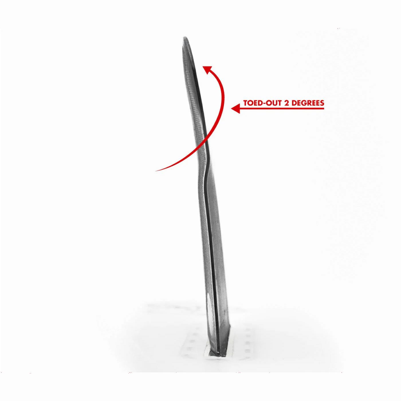 Toe at the fin base is in respect to the box placement, transitioning to 2 degrees less at the tip gives a tight & engaged feel.