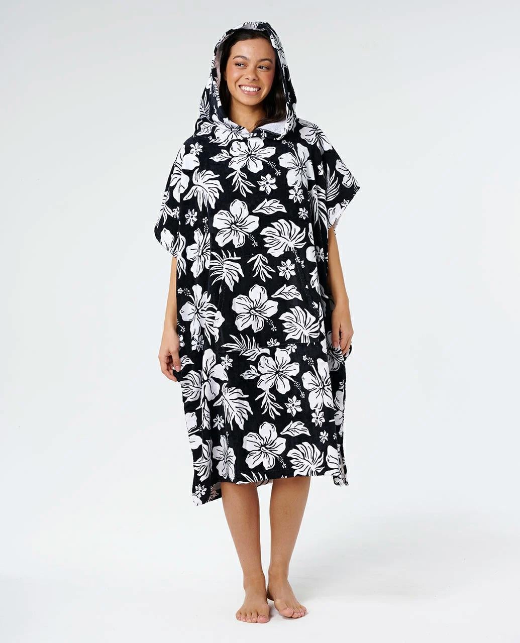 Features: COTTON VELOUR 330GSM, Standard fit hooded towel with sleeves, Kanga pocket, Logo patch, Side change pockets, Match back to swim, Side splits, Length from top shoulder point 104cm.